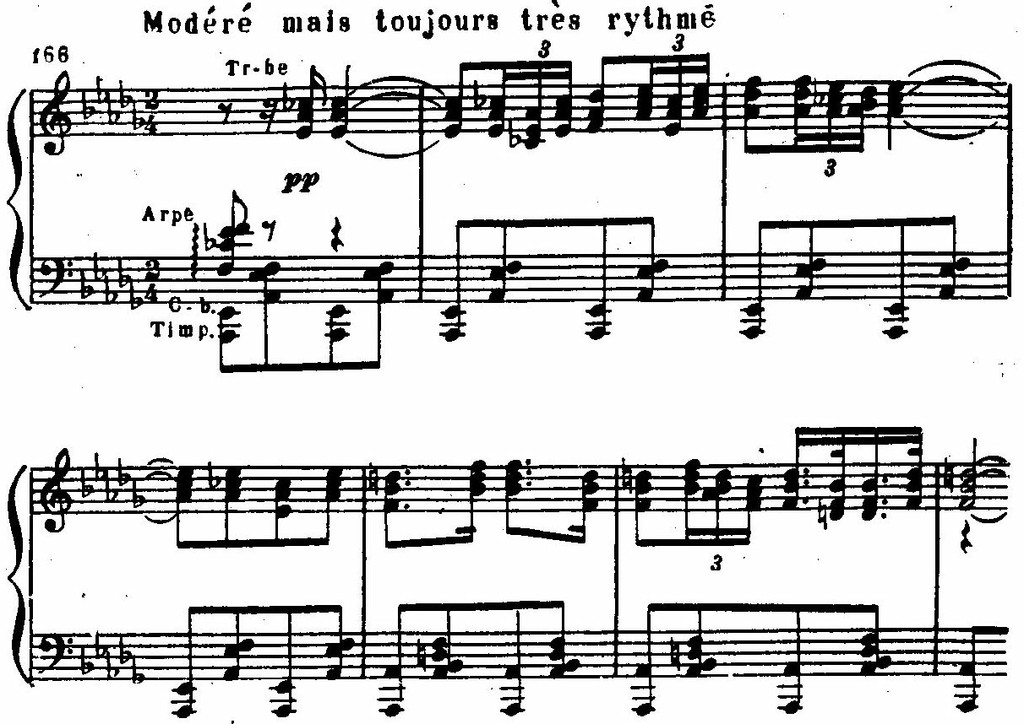 В гармоническом освещении темы марша Дебюсси использует сочные краски: цепочки септаккордов и их обращений в различных тональностях, в которые входит остинатный бас ля-бемоль или соль-диез.