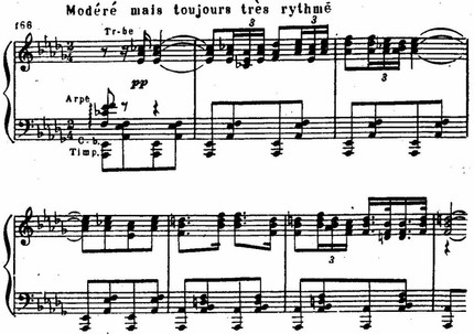 (являющимся своеобразным ритмическим остовом всей второй части «Ноктюрнов»), характерными кварто-квинтовыми созвучиями у скрипок на ff в высоком регистре, которые придают яркую солнечную окраску началу части.