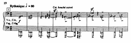 На этапе наибольшего напряжения возникает — в виде контрапункта к фигурационному движению — протяжная мелодическая линия у медных, своеобразный гимн стремительному бегу машины.