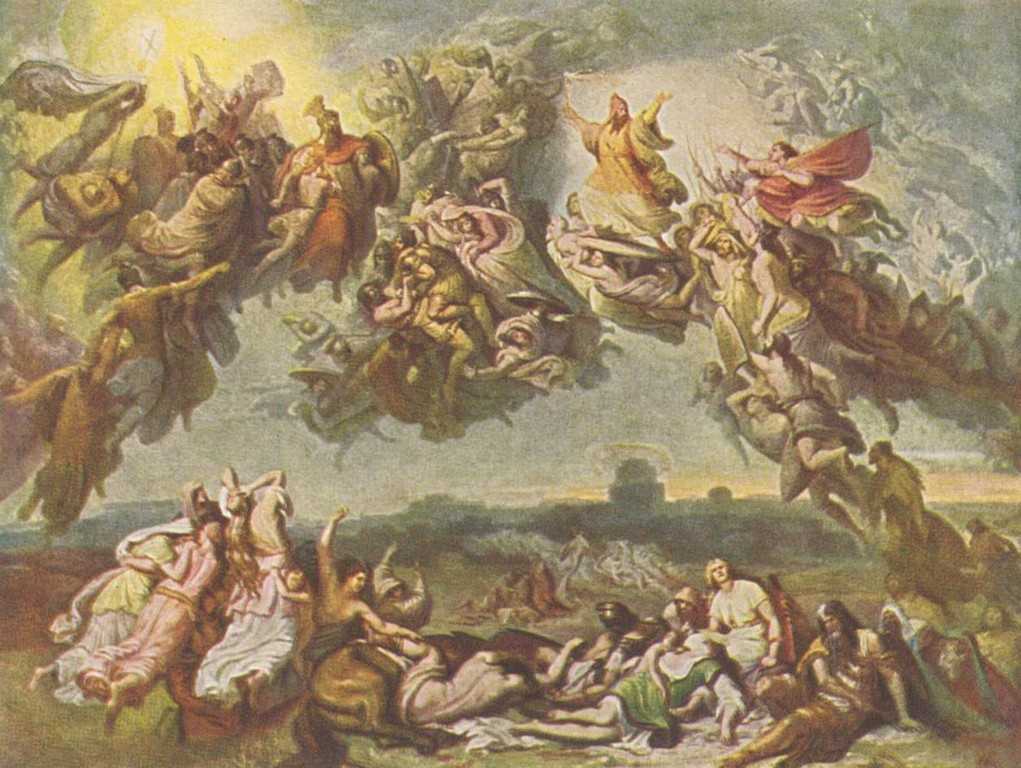 Написанная в 1834—1835 годах модным историческим живописцем Вильгельмом фон Каульбахом (1805—1874), она вместе с другими фресками украшала парадную лестницу нового Берлинского музея. На картине изображена кровавая битва, кипевшая весь день и оставившая на земле лишь нескольких раненых. Она продолжается на небесах, где в центре одной группы — могучий гунн в шлеме с поднятым мечом, а другую группу осеняет крестом летящий ангел.