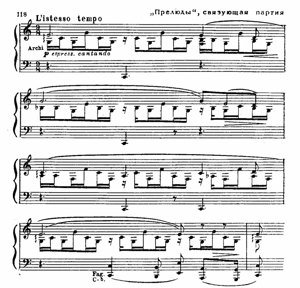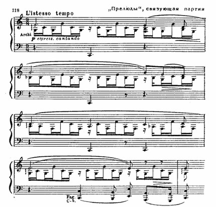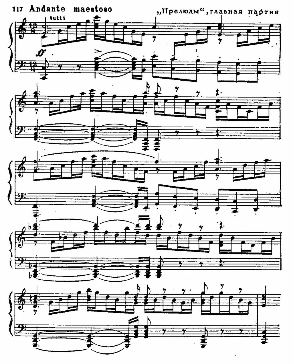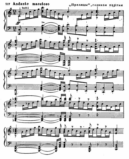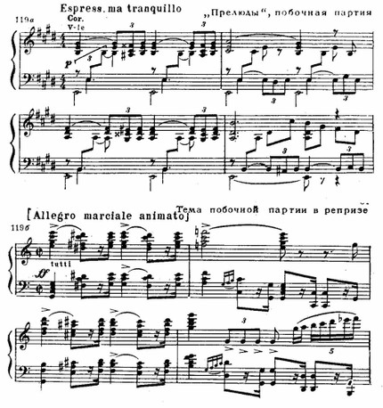 Незаметно начинается зеркальная реприза, сливающаяся с разработкой (тема побочной партии в сочетании с темой пасторали, C-dur). Все более крепнут героические возгласы, призывы к действию, и под конец возникает картина массового народного ликования. В показе конечного торжества, однако, сохраняется напряженность развития, словно напоминание о тех трудностях, которые пришлось преодолеть герою на пути к победе. Это сближает репризу «Прелюдов» с бетховенскими финалами, представляющими собой, по выражению Асафьева, «напряженную устойчивость»: «Ликование финала звучит так: борьба продолжается, ибо такова жизнь, а сейчас — радость».