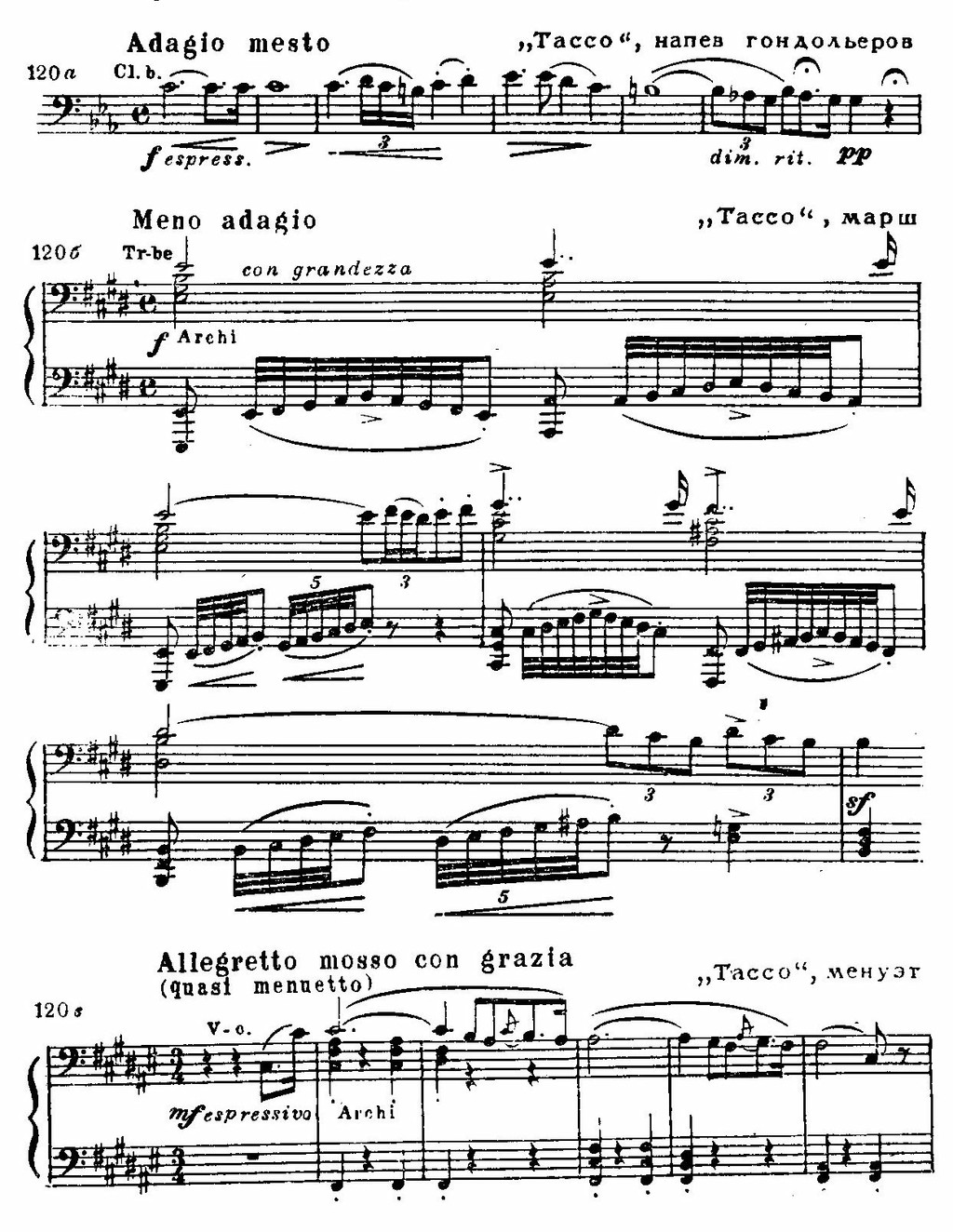 Ее первый раздел изображает Тассо в темнице — слышатся его стоны, жалобы, которые сменяют безуспешные порывы к свободе. Основная тема, звучащая у бас-кларнета (c-moll; см. пример 120 а), рисует образ поэта, сохранившийся в народных преданиях, — он возникает словно сквозь дымку воспоминаний. Причем напев венецианских гондольеров сближается Листом с венгерскими темами повествовательного и скорбного характера (ср. начало Второй рапсодии, тему b-moll Шестой рапсодии и т. д.). Постепенно воспоминания оживают, и мы видим героя таким, каким он был в жизни — и в его лирических переживаниях (тема у солирующих виолончелей и валторны, As-dur), и в героических порывах (медные и струнные, E-dur; см. пример 120 б). Трепетный речитативный раздел подводит к новому эпизоду: Лист показывает Тассо на фоне придворного менуэта (струнные, Fis-dur; см. пример 120 в).