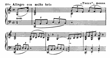 Внезапно светлое видение исчезает — поэт снова в темнице; повторяется (в сокращенном виде) первый эпизод. И непосредственно с этим трагическим эпизодом сопоставляется ликующий финал поэмы (C-dur; см. пример 120 г) — картина народного торжества, прославления героя; главная тема поэмы, многократно варьируемая, приобретает характер триумфального шествия. Этот апофеоз, в отличие от финала «Прелюдов», однако, несколько растянут и статичен.