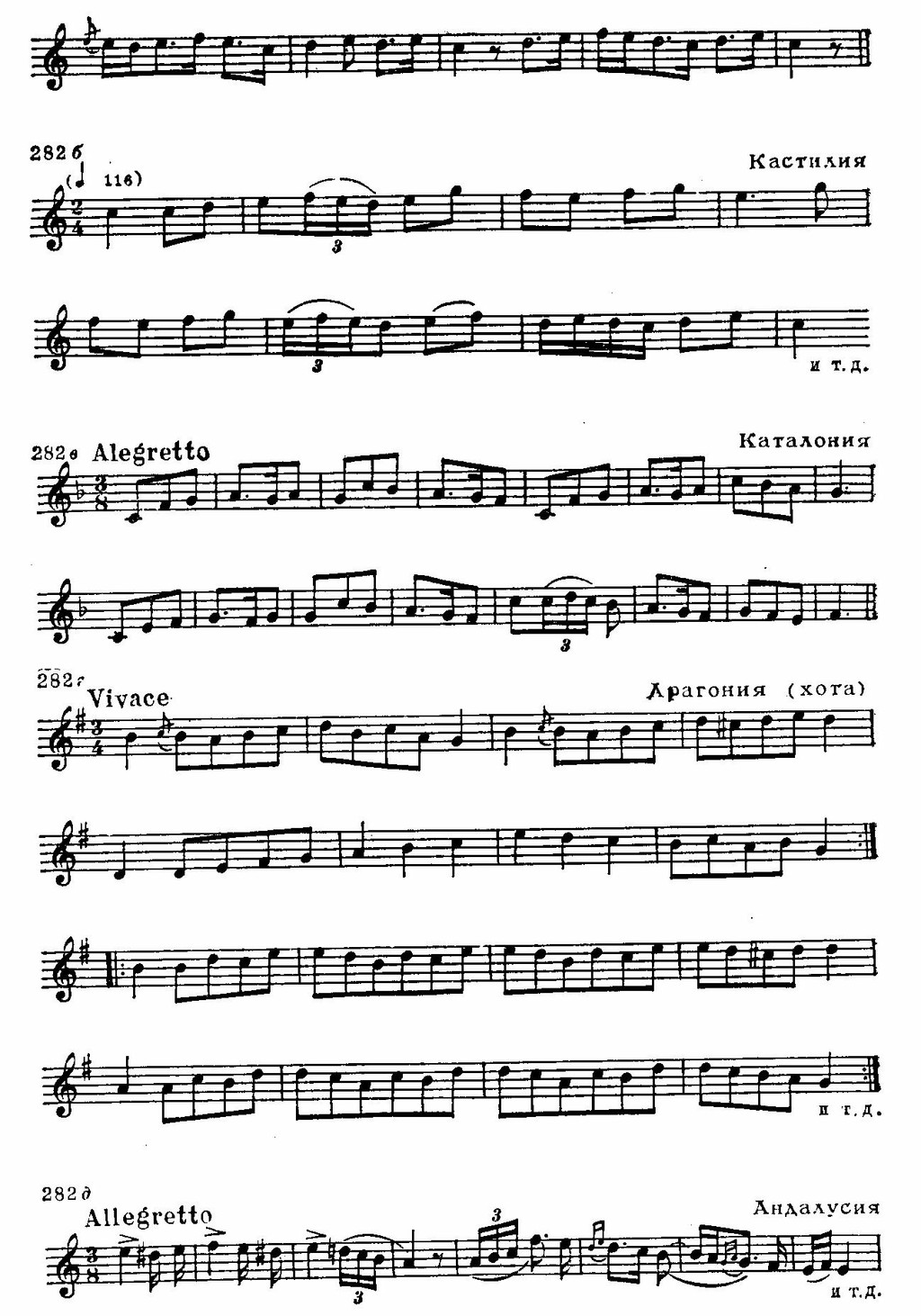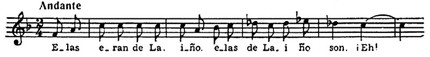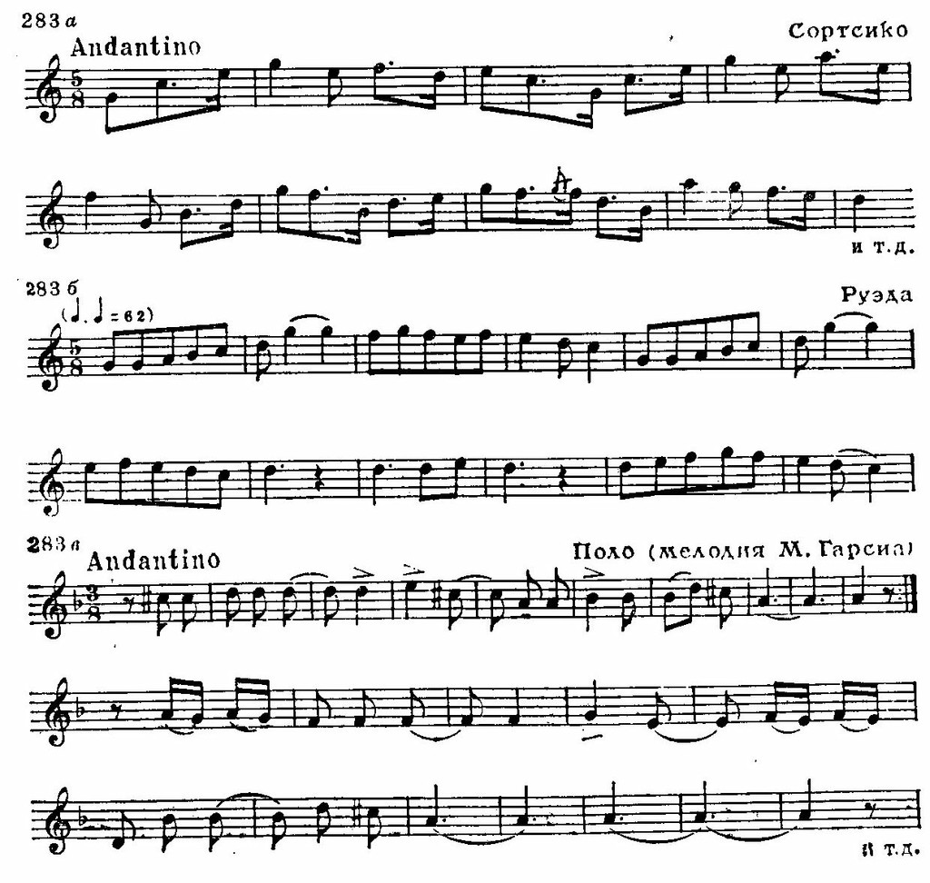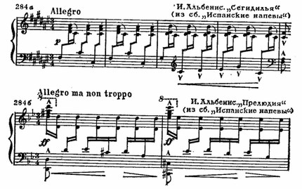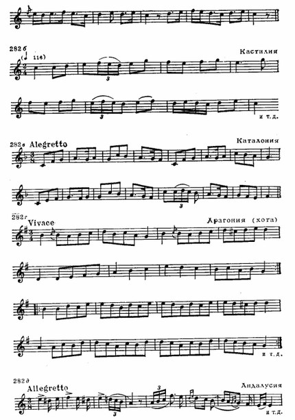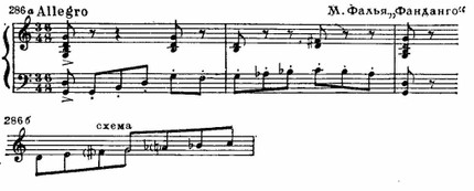 Национальное своеобразие обнаруживается и в складе испанских мелодий, которым свойственно заключение на доминанте. Вообще доминанта является как бы «центром притяжения» интонационного развития. К этому «центру» нередко устремляются два тетрахорда — снизу и сверху, доминантовый тон их объединяет. Нижний тетрахорд обычно мажорный, верхний — минорный, что при большой роли доминанты придает всему ладу фригийский оттенок (см. заключение «Фанданго» Мануэля де Фальн и схему 286 б):