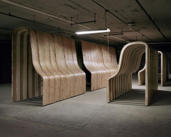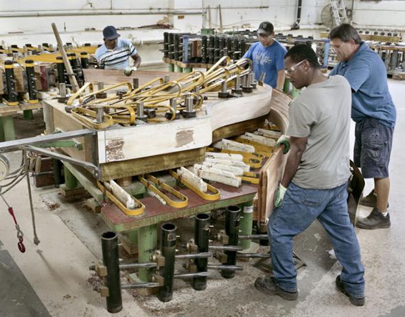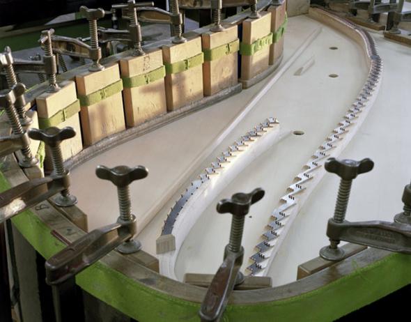18 листов шпона твердого клена, длиной до семи метров каждая, используются для изготовления боковых стенок рояля. Все слои покрываются клеем, соединяются между собой и формуются с помощью специального гибочного пресса, напоминающего гигантские тиски в форме рояля. Бригада мастеров выравнивает все слои и затем стягивает при помощи хомутов.