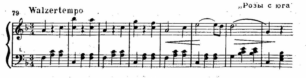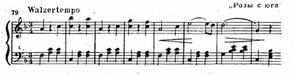 Подвижна, изменчива и гармония Штрауса (см. пример 78), что еще более подчеркивается моцартовски ясной и певучей манерой инструментовки.