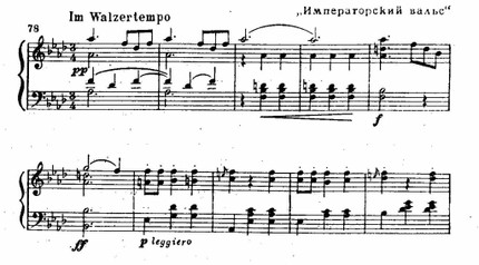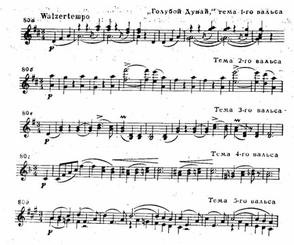 Среди концертно-бытовых произведений Иоганна Штрауса около трети занимают вальсы. В разработке этого жанра композитор многое взял от своих предшественников. Ему, конечно, были известны и лендлеры Шуберта, и «Приглашение к танцу» Вебера (1819), где впервые дана «поэмная» трактовка вальса. Сам Штраус вменял себе в заслугу расширение музыкальной формы вальса, придание ему более «протяженного» мелодического дыхания; чтобы убедиться в справедливости этого замечания, достаточно сравнить вальсы Штрауса-отца и сына. Но более того, он вдохнул новое содержание в вальс, опоэтизировал его. Лучшие сочинения Штрауса, такие, как «Голубой Дунай» (ор. 314), «Жизнь артиста» (op. 316), «Сказки венского леса» (ор. 325), «Весенние голоса» (ор. 410) и другие, представляют своего рода танцевальные поэмы. Их содержание богато оттенками различных душевных состояний. Причем переходы от одного состояния к другому — и в этом особая прелесть музыки Штрауса — всегда естественны, хотя нередко совершаются неожиданно. В качестве примера приведем отрывок из «Императорского вальса» (ор. 437):