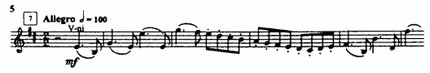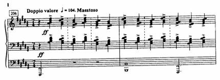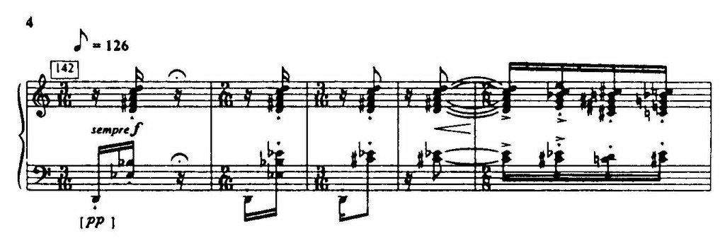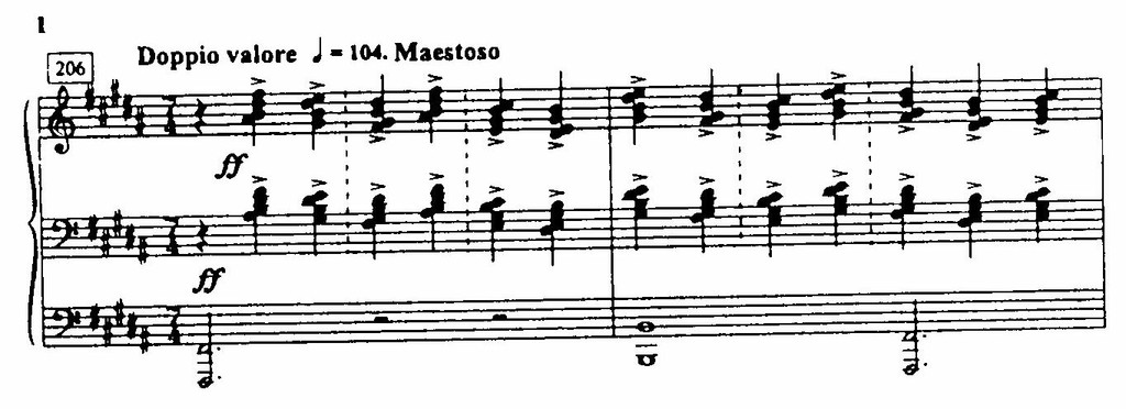 Ритм в «Весне священной» из фактора, обычно подчиненного, превращается в фактор первостепенный, определяющий — рисует ли Стравинский пробуждение земли, или плетет хороводы, или придает ритму заклинательную функцию в «Выплясывании земли» и особенно в «Великой священной пляске». Ритм опрокидывает «барьер» тактовой черты, дышит в свободно чередующихся размерах (пример 4), образует сложную полиметрическую вязь.