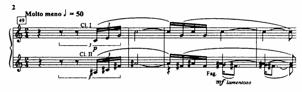 Техника работы с мелодическим материалом остается, в общем, той же, что и раньше: перестановка мотивных звеньев, их сжатие и расширение и т. д. Вместе с тем моментами можно заметить особую приверженность Стравинского к интервальным перемещениям — параллельно с ритмическими преобразованиями (см., например, цифру 44). Эти перемещения приобретают пуантилистский характер, предвосхищая эволюцию Стравинского к серийной технике.