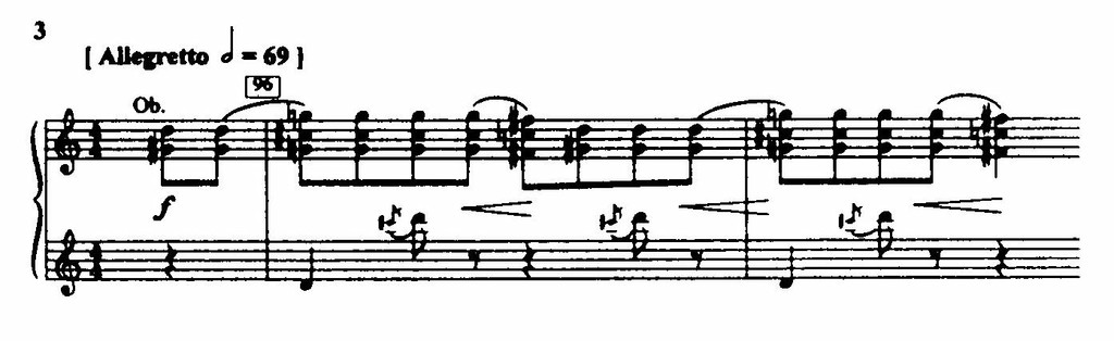 Развитие от Танца кормилиц до Танца кучеров и конюхов идет по нарастающей. В Танце кормилиц Стравинский использует параллелизмы тритонов, вносящие преимущественно фонический эффект (пример 3), а в пляске кормилиц с кучерами и конюхами, являющейся кульминацией сцены, он прибегает к максимальной интенсификации средств путем уплотнения аккордов и роста оркестровой звучности.