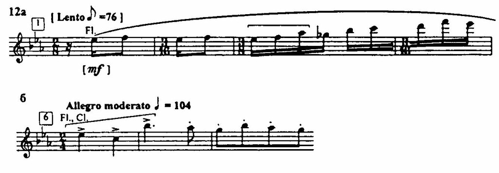 В Октете можно наблюдать, как на первый взгляд барочные мотивы оказываются неожиданно близки русским попевкам (встречающимся, например, в «Сказке о солдате», «Свадебке»), а те, в свою очередь, облекаются в барочный наряд. Так, мотив Lento развивается в духе попевки (пример 12а), а когда он становится ядром темы Allegro (структура Allegro — миниатюрная сонатная форма с зеркальной репризой), то меняется и его интервальный рисунок — благодаря перемещениям звуков (пример 12б), — и его фактура, приобретающая жесткость и динамику контрапунктических линий.