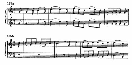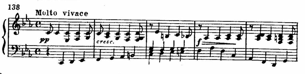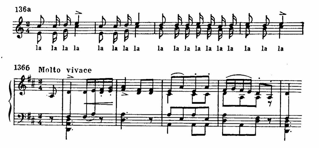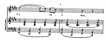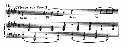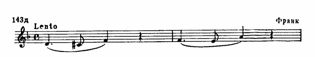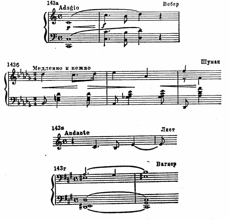 Самьель обрисован лейттемой (см. пример 138), лейттональностью (c-moll), лейттембром (флейты в низких регистрах). «Роговые» интонации и тембр валторны, сближающие массовые охотничьи сцены первого и третьего актов, тоже являются своего рода лейтмотивами.