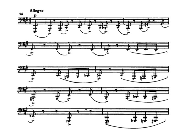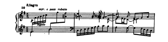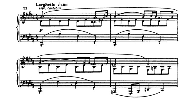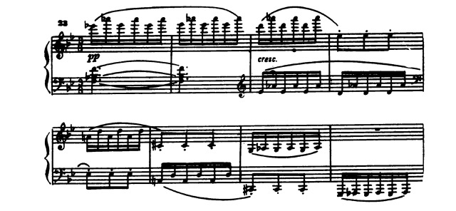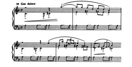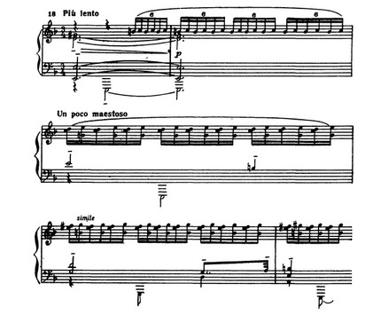 Мучительно и полно огромной внутренней значительности нагнетание восьмых сопровождения и шестнадцатых мелодической линии, неизменно произносимых по два звука (словно исполняемых на один смычок). Преодолевая постоянное сопротивление, шаг за шагом взбирается тема все выше и выше, время от времени отбрасываемая назад резкими пунктирными толчками: