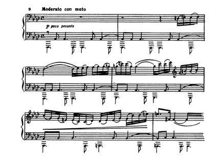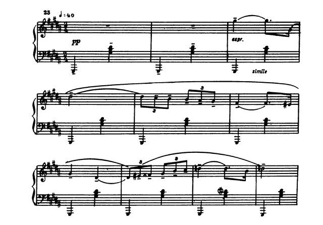 Мерное, торжественное развитие музыки, постепенное «обрастание» темы новыми контрапунктическими голосами внезапно сменяется зыбким, словно издалека возникающим трелеобразным движением шестнадцатых, пробуждая отдельные ассоциации с произведениями Мусоргского или Римского-Корсакова: