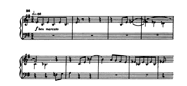 В следующем далее «Речитативе» вновь господствуют трагически-мрачные интонации басов, подобные неумолимому приговору: «Смирись, повинуйся!». Как бы противясь им, с огромной внутренней силой звучит «отповедь» упругих остро-пунктирных квартовых интонаций (несомненна преемственность их как с первой пьесой цикла — «Прелюдией», так и, особенно, с предшествующей частью — «Ostinato»):