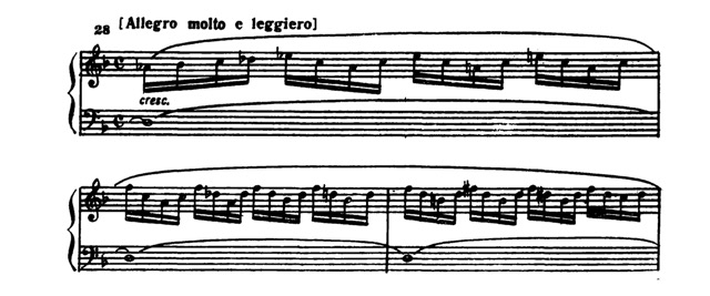 В сонате же указанный принцип применен в более широких масштабах (тематическая преемственность между частями цикла). Так, обращает внимание утверждение восходящей квартовой интонации (основы построения тем первой части) в конце финала произведения. Кстати, ход этот приобретает здесь противоположное, нединамизирующее, как в начале, а стабилизирующее значение. Заимствован из первой части и сам принцип «превращения» динамики в статику, хотя в первой части сонаты стабилизирующей была не восходящая квартовая, а нисходящая терцовая интонация. Как «сгустки» смятенных интонаций, заимствованных из разработки первой части, воспринимаются в финале «свистящие» пассажи. Напротив, в виде своеобразного разрешения, уравновешивания напряженного пунктирного ритма, характерного для первой части, предстает в финале «заполнение» его движением непрерывных шестнадцатых.