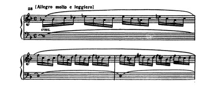 Полифонические тенденции в фортепианных сочинениях Свиридова получают отражение, так сказать, и в «микромасштабах», когда поочередное «сползание» по ступеням скрытых голосов фортепианной фигурации образует своего рода гармонические переливы («Дождик» из «Детского альбома»):