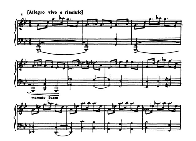 Беспокойно мятущаяся, упруго-непокорная главная тема сонаты (Allegro vivo е risoluto) — драматический монолог, подготавливаемый решительными, волевыми интонациями восходящих кварт. Он звучит сперва в низах, а затем в верхнем регистре рояля, сочетаясь с непрерывным пунктирным ритмом противосложения. Даже вторгающееся временами нарочито подчеркнутое утверждение тонических гармоний не может успокоить взволнованность музыкальной речи, дать ответ на главный, изначальный вопрос, привести к разрешению острого жизненного конфликта: