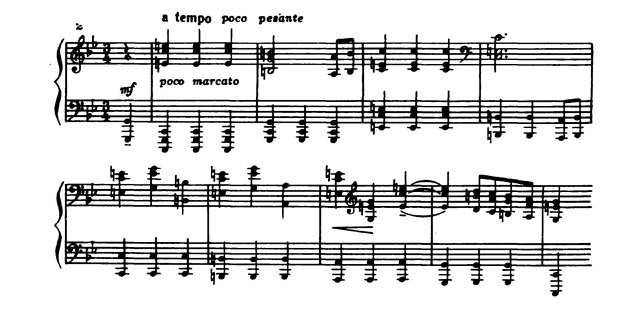 Действительно, во второй части сонаты (Largo) драматический конфликт значительно обостряется. Необычайно взволнованные речитативные реплики, кажется, воплощают терзающие душу сомнения. Отвечающие же им остинатные реплики, напротив, неумолимо-бесстрастны.