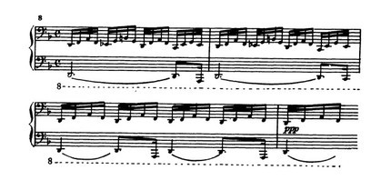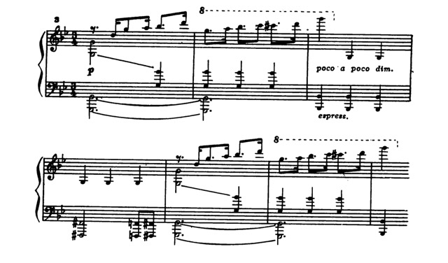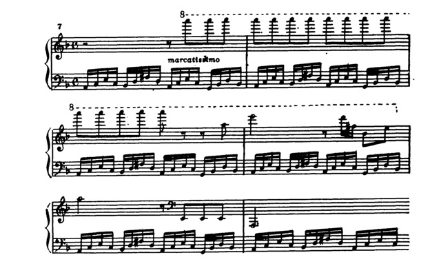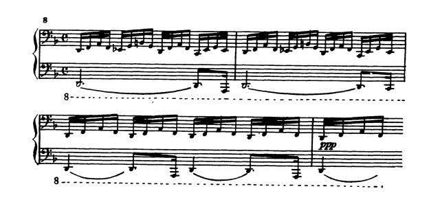 Все настойчивее «стучатся» в разных регистрах фортепиано реплики остинатно повторяющихся восьмых, словно стремясь пробиться сквозь сплошную пелену окутывающей их фигурации: