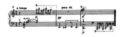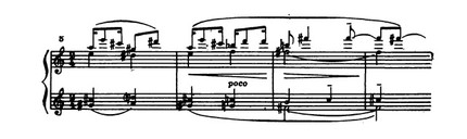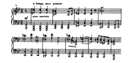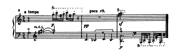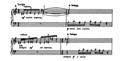 Полярной образной контрастности этих чередующихся фраз соответствует противоположность средств музыкальной выразительности: речитативным возгласам (характерны здесь авторские ремарки — rubato, molto espressivo), отмеченным интонационной изысканностью и даже своего рода изломанностью декламационной линии, обильно хроматизированной, с их необычайным ритмическим многообразием и акцентированием каждого звука, противостоят неподвижные, подчеркнуто метричные ритмические формулы, должные, согласно указаниям композитора, исполняться a tempo и secco non espressivo: