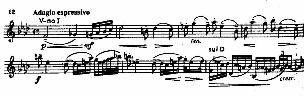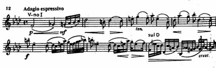 С классичностью структур сочетаются наполненный экспрессией тематизм и сложный гармонический язык. Выразительно представляет танеевскую мелодику тема Adagio espressivo — патетический монолог скрипки. В ней, как и во многих темах Чайковского, обилие задержаний на нисходящих секундах, опеваемых звуков. Но отсутствие черт жанровости при заостренных интонациях (подчеркнутая хроматика начала, напряженные интервалы — большая септима, увеличенная квинта, уменьшенная кварта) приводит к повышенной экспрессивности, встречающейся в мелодике ряда композиторов следующих десятилетий.