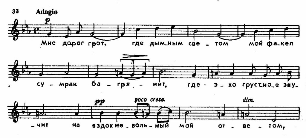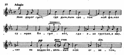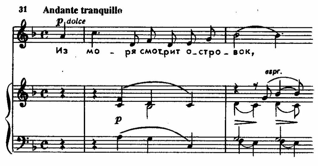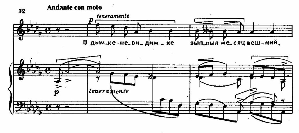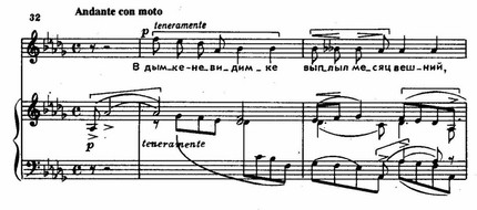 Здесь три комплекса: октава на звуке доминанты; мелодия, напоминающая побочную тему Шестой симфонии Чайковского; пары нисходящих малых секунд. Уже в первых двух тактах есть повторения, тематизация ткани (не только повторений, но сращений комплексов, их модификаций) в дальнейшем поразительна. Между вокальной строкой и партией фортепиано постоянно возникают имитации, и голос на равных с инструментом участвует в тематическом развитии и взаимодействии тем.