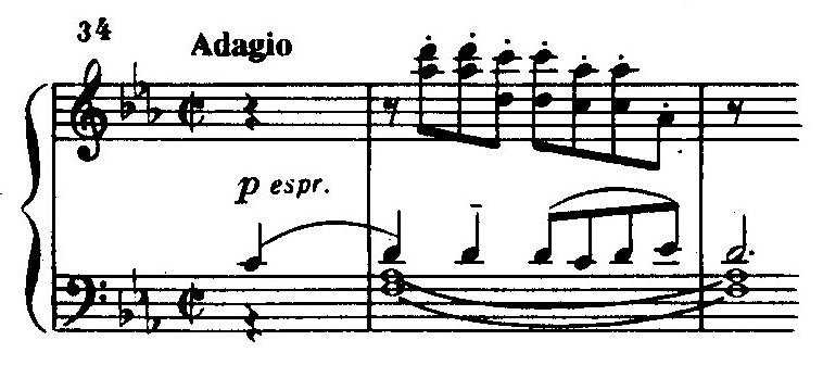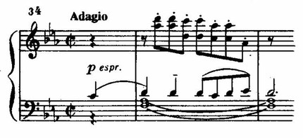Тема и лаконична и содержательна; диапазон малой терции, четырежды повторенный звук ре создают впечатление оцепенения, укрепляемое медленным темпом и мягко-неустойчивой гармонией II7. Тема и ее оформление имеют и изобразительный смысл. Упорно повторяемый звук — как бы «капли падают на плиты», а идущие навстречу восходящая секунда до — ре и нисходящая ре — до в верхнем голосе (еще один момент сцепления, единства), вообще встречное движение словно рисуют образ сталактитов. Мерное движение восьмыми выдержано на протяжении всей пьесы, без отступления.