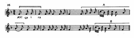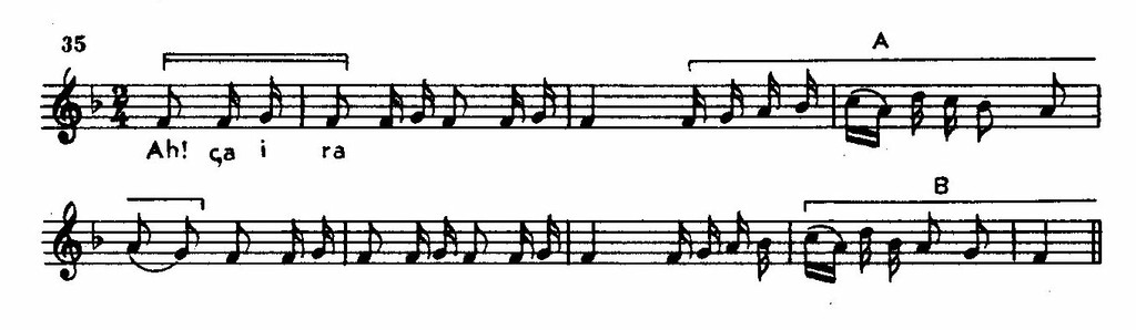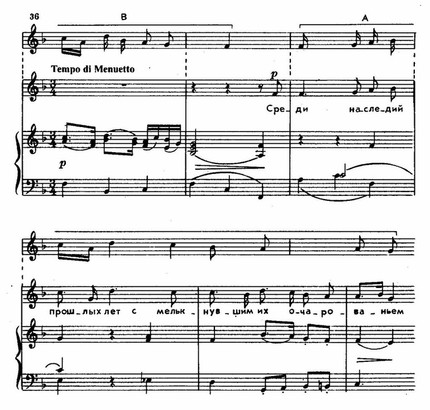 — основа «Ça ira», буквально пронизывающая всю пьесу и особенно ее среднюю часть, где сама французская песня звучит преображенно (притом только в фортепианной партии, в доминантовом ладе минора, в быстром темпе, в звучании двойного контрапункта). Развитие образов и музыкальных тем в «Менуэте» настолько интенсивно, их взаимодействие столь диалектично и глубоко, что в известном смысле здесь можно говорить о симфонизме. В третьей части «Ça ira» проводится в одноименном миноре. Не пытаясь на этом основании отыскивать черты сонатности, отметим все же это тональное сопоставление, весьма редкое в вокальной музыке.