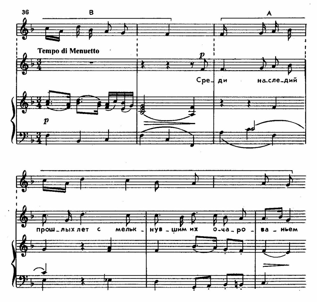 «Менуэт» — развернутая трехчастная композиция. Первая часть — образ менуэта «с его умильным замираньем», веселой, беспечной жизни. Средняя часть — совсем иной образ, образ возмездия; для его воплощения композитор и обратился к песне «Са ira». Принято считать, что темы собственно менуэта и «Ça ira» у Танеева противоположны. Однако противостоят друг другу образы, но не собственно музыкальные темы, ибо песня Французской революции является основой всего романса: его начальные такты — не что иное, как варьированное изложение последних двух тактов песни (см. в примере 35 В), прямо отражает мелодию песни и вокальная партия (см. в том же примере А). Задумав это произведение, Танеев исходил из музыкального образа революции и все содержание и развитие подчинил ему.