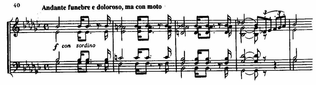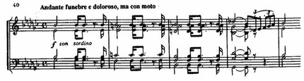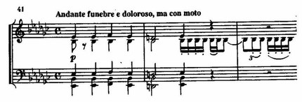 Третья часть – Andante funebre e doloroso ma con moto – написана в характере похоронного марша, она являет собою средоточие трагического настроения Квартета. И в тональном, и в смысловом отношении она перекликается с мрачным вступлением к первой части. Скорбный характер первой темы усиливается приглушенным, холодным звучанием скрипки с сурдиной, диссонирующими аккордами с секундовыми созвучиями наверху. Затем возникает некое подобие заупокойной церковной службы: безжизненный четырехголосный хорал с последующей монотонной речитацией скрипки на одном звуке. Общего скорбного настроя третьей части не нарушает даже мажорная вторая тема – не случайно она снабжена указанием con dolore (со скорбью).
