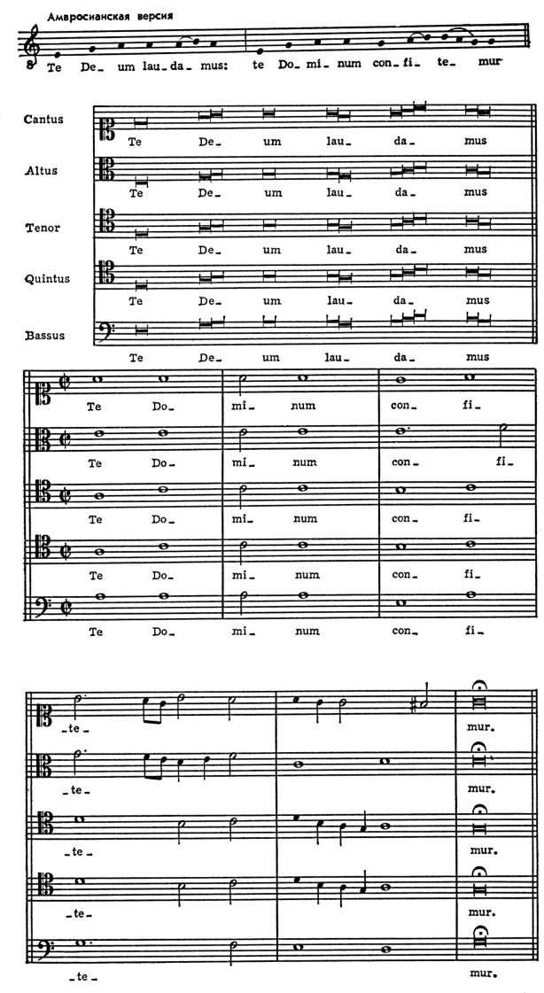 Te Deum (Te Дeум, от начальных слов лат. текста «Те Deum laudamus» — «Хвала тебе, боже»; англ. We praise Thee, О God; нем. в пер. М. Лютера Herr Gott, dich loben wir) — хвалебный благодарственный гимн, исполняемый в рамках христианского богослужения (Te Deum входит в состав службы Matutinum, см. Церковная музыка), в торжеств. случаях (посвящение в епископы, священники). Возникновение T. D. относят к 3–4 вв. Мнения об авторстве текста (написанного в подражание псалмам) расходятся: среди возможных имён называют миланского епископа Амвросия (отсюда распространённое назв. — амвросианский гимн), рамесианского епископа Никиту и др. Ранний Te Deum — одногол. мелодия с текстом, родственная григорианскому хоралу (см. Григорианское пение). Первый сохранившийся образец двухгол. Te Deum относится к кон. 9 в. (приведён в «Musica enchiriadis») и представляет собой параллельный органум. Известный Te Deum в стиле фобурдона принадлежит Ж. Беншуа. В 15–16 вв. хоральная мелодия Te Deum становится основой для полифонич. композиций в характере мотета (X. Астон, И. Вальтер, О. Лассо, Палестрина и др.), хотя в Te Deum этого времени широко используется и аккордовая фактура; осуществляют также Te Deum в виде органных переложений.