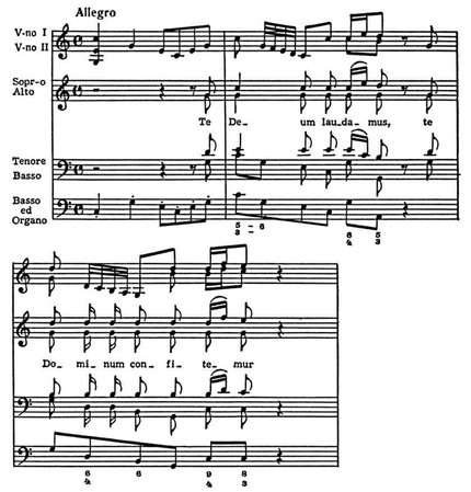 В 17 в. исполнительский состав Те Deum увеличился: многоголосный или многохорный, он сопровождался basso continuo (см. Генерал-бас) или оркестром (напр., 24-гол. Те Deum И. Г. Шейна, Те Deum Г. Шюца для двух 4-гол. хоров и инструментов, Те Deum M. Преториуса, а также Я. П. Свелинка, Т. Таллиса, Г. Пёрселла, Ж. Б. Люлли и др.). В целом Те Deum, связанный с древним гимном только общим текстом, приблизился к праздничной кантате и исполнялся по торжеств. случаям коронаций, выдающихся воен. побед и т. д. (напр., Те Deum Сарти, Генделя). Те Deum этого времени состоял из контрастных разделов или самостоят. частей, в к-рых чередовались хоровые и сольные эпизоды, полифонич. и гомофонное изложение (Те Deum Гайдна, Моцарта и др.).