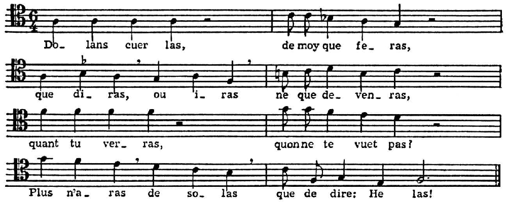 У Г. де Машо (к-рый сочинял и одноголосные муз. произв.) в одном из лэ (No 12; «Лэ о смерти») часть «Dolans cuer las» написана в мажорном ладу с доминированием тонич. трезвучия во всей высотной структуре: