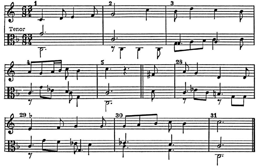 Однако старые церк. лады повсеместно встречаются в музыке 1-й пол. 17 в., напр. у Дж. Фрескобальди (Ricercare sopra Mi, Re, Fa, Mi — Terzo tuono, Canzona — Sesto tuono. Ausgewдhlte Orgelwerke, Bd II, No 7, 15), С. Шейдта (Kyrie dominicale IV. Toni cum Gloria, Магнификаты, см. Tabuiatura nova, III. pars). Даже у И. С. Баха, в музыке к-рого господствует развитая гармонич. Т., подобные явления — не редкость, напр. хоралы Aus tiefer Not schrei' ich zu dir и Erbarm' dich mein, о Herre Gott (по Шмидеру No 38.6 и 305; фригийский лад), Mit Fried' und Freud’ich fahr' dahin (382, дорийский), Komm, Gott Schцpfer, heiliger Geist (370; миксолидийский).