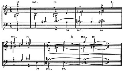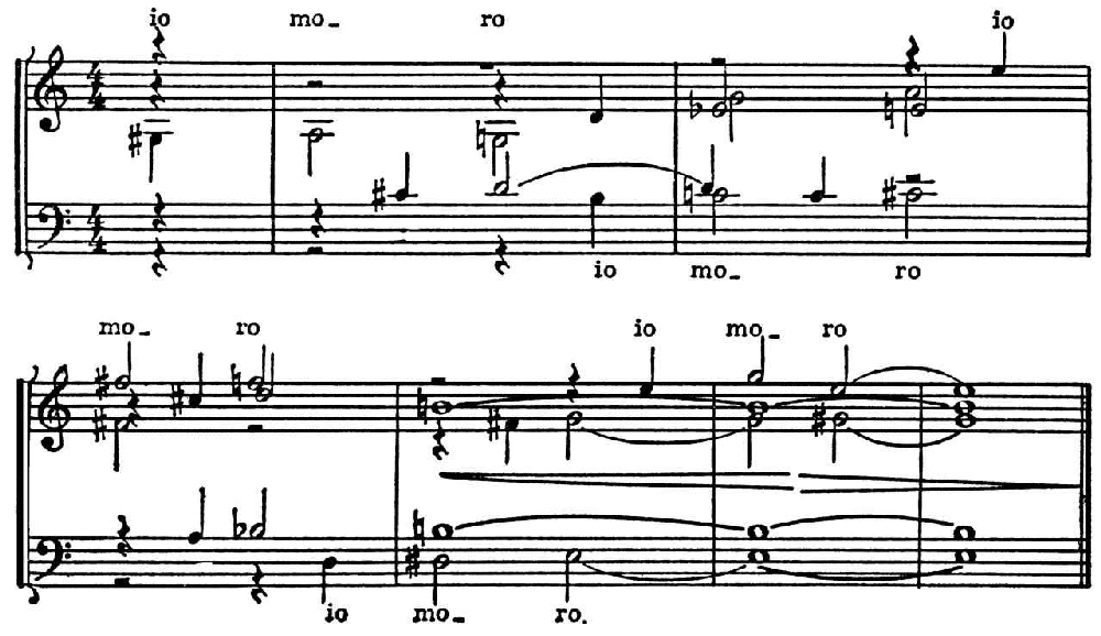 Впечатление гармонии. Т. возникает вследствие метризованных функциональных смен и преобладания гармонич. соединений в кварто-квинтовом соотношении, T — D и D — T в гармонич. структуре целого. Вместе с тем центром системы является не столько трезвучие (хотя оно изредка встречается, такты 29, 30), сколько квинта (допускающая и большую и малую терцию без намеренного эффекта смешанного мажоро-минорного лада); лад скорее мелодический, чем аккордовый (аккорд не лежит в основе системы), ритм (лишённый метрич. экстраполяции) — не тональный, а модальный (пятитакты без всякой ориентации на квадратность); тональное тяготение заметно по краям построений, а не сплошь (вок. часть начинается вообще не с тоники); отсутствует как тонально-функциональная градация, так и связь консонантности и диссонантности с тональным значением гармонии; в распределении каденций непропорционально велик уклон в сторону доминанты. В целом даже эти явные признаки Т. как ладовой системы особого типа всё же не позволяют относить подобные структуры к собственно Т.; это типичная модальность (с точки зрения Т. в широком смысле — «модальная тональность») 15–16 вв., в рамках к-рой вызревают отд. компоненты Т. (см. Dahinaus С, 1968, р. 74–77). Разложение церк. ладов в нек-рых муз. произв. кон. 16 — нач. 17 вв. создало особый тип «свободной Т.« — уже не модальной, но ещё и не классической (мотеты Н. Вичентино, мадригалы Луки Маренцио и К. Джезуальдо, «Энгармоническая соната» Дж. Валентини; см. пример в колонке 567, внизу).
