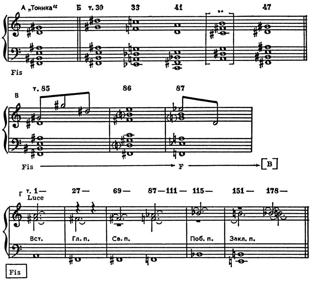 В произв. А. Н. Скрябина позднего периода творчества Т. сохраняет свои структурные функции, однако традиц. гармонии заменены новыми, создающими особый лад («скрябинский лад»). Так, напр., в «Прометее» центр. аккорд — знаменитое «прометеевское» шестизвучие с осн. тоном Fis (пример, А, ниже), центр. сфера («главная Т.») — 4 таких шестизвучия по малотерцовому ряду (уменьшенному ладу; пример Б); схема модуляции (в связующей партии — пример В), тональный план экспозиции — пример Г (гармонич. план «Прометея» своеобразно, хотя и не во всём точно, зафиксирован композитором в партии Luce):