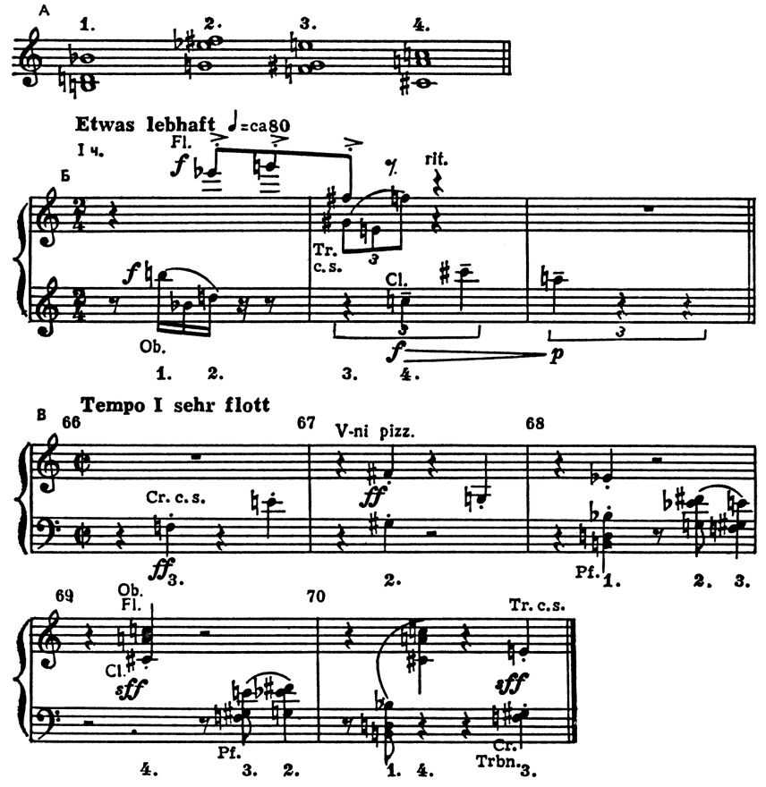 Так, используя родство серийных рядов в концерте ор. 24 (серию см. в ст. Додекафония), Веберн получает группу трёхзвучий на определ. высоте, возвращение к-рым воспринимается как возвращение в «главную тональность». В примере ниже приведены трёхзвучия осн. сферы (А), начало 1-й части (Б) и конец финала концерта Веберна (В).