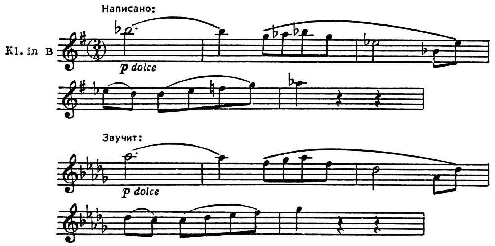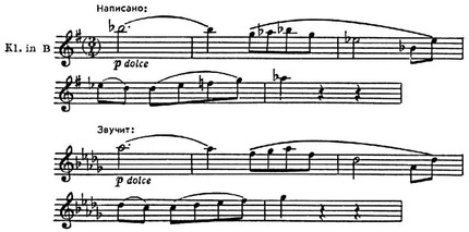 К транспонирующим инструментам принадлежат амбушюрные медные духовые инструменты (валторны, трубы, корнеты, разновидности тубы, саксгорны), многие деревянные духовые (семейства кларнетов, саксофоны, разновидности гобоя — англ. рожок, гобой д’амур, гекксльфон); как транспонирующие инструменты могут рассматриваться также струнные смычковые, перестроенные на определенный интервал — выше или ниже их обычной настройки (см. Скордатура). К Т. и. относят и инструменты, звучащие по сравнению с нотацией октавой ниже (контрабас, контрафагот) или октавой выше (флейта пикколо, челеста, ксилофон, колокольчики), однако по существу это не является транспозицией, т. к. ступени звукоряда сохраняют свои наименования. Естеств. ряд звуков, соответствующий устройству инструмента (у медных духовых — натуральный звукоряд обертонов), для Т. и. нотируется в тональности C-dur. В зависимости от настройки (строя) инструментов нотированные в C-dur звуки в действительности звучат на обусловленный интервал выше или ниже, напр. с2 у кларнета in В прозвучит как b1 (у кларнета in, А — как а1), у англ. рожка или валторны in F — как f1, y альтового саксофона in Es — как es1, y тенорового in В — как b, y трубы in Es или у саксофона-сопранино — как es2 и т. д.