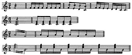 Повторяющийся звук или аккорд записывается в суммарной длительности всех повторений. Скорость исполнения тремоло обозначается с помощью рёбер или вязок.