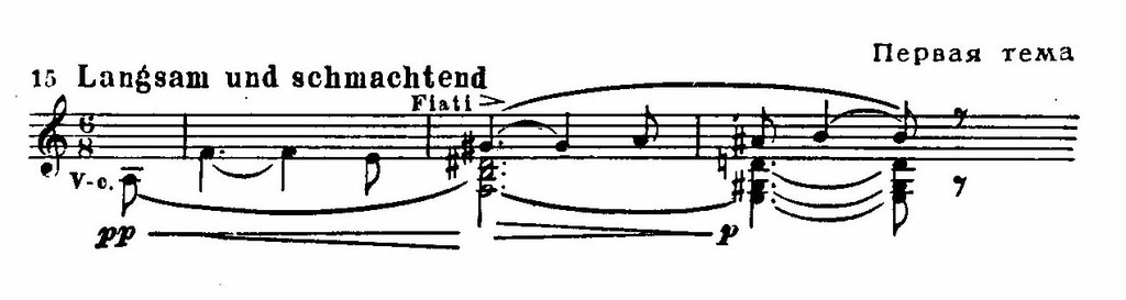 Она проводится трижды (четвертое, неполное проведение звучит отголоском предшествующих), после чего возникает вторая тема любовного томления: