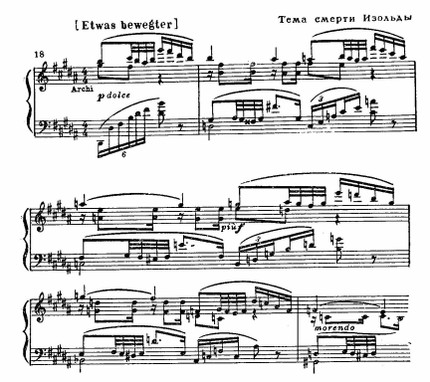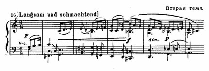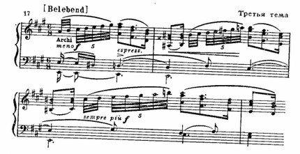 Развитие этих тем (после 16-го такта) рождает более связную динамическую волну, подводящую к A-dur. Ее вершина подчеркивается появлением третьей, исступленно восторженной темы (64—65 такты):