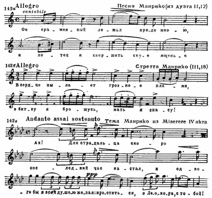 Глубоко впечатляет также финальный терцет, в котором предсмертное драматическое объяснение Манрико с Леонорой происходит на фоне песни Азучены, грезящей о вольных просторах родины. В подобных эпизодах — а их немало в опере — сюжет, явно страдающий романтическими преувеличениями, получает реалистическое истолкование в музыке.
