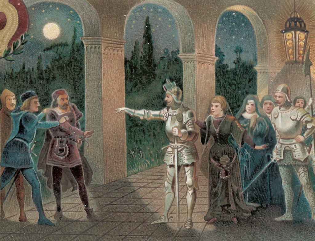 Первый акт — «Дуэль». Первая картина передает мрачную, гнетущую атмосферу средневекового замка, предвосхищая последующие жестокие и кровавые события. В центре картины — рассказ Феррандо с хором «Два у графа сыночка милых было». Рассказ начинается в спокойно-повествовательной манере, но все более насыщается тревожным чувством, взволнованной порывистостью.