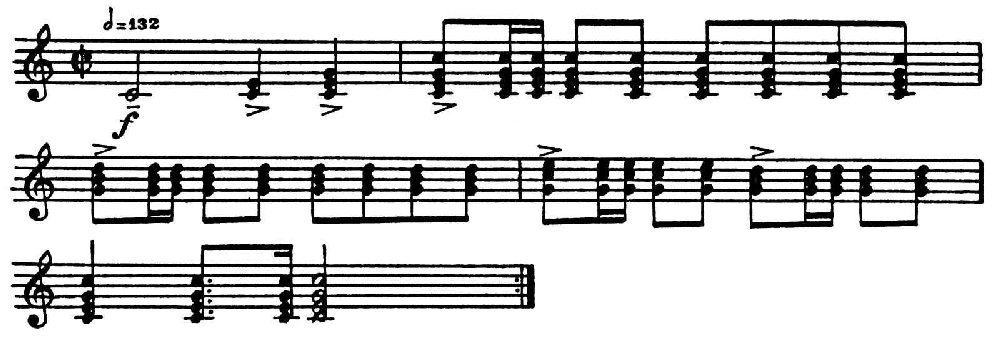 Состоит обычно из одного музыкального предложения, повторяемого несколько раз. Музыкальный размер — 4/4 alla breve или 2/4; темп быстрый (