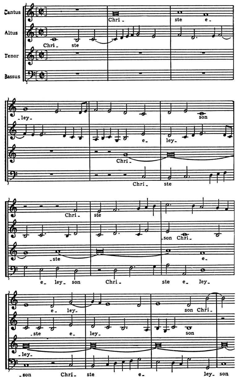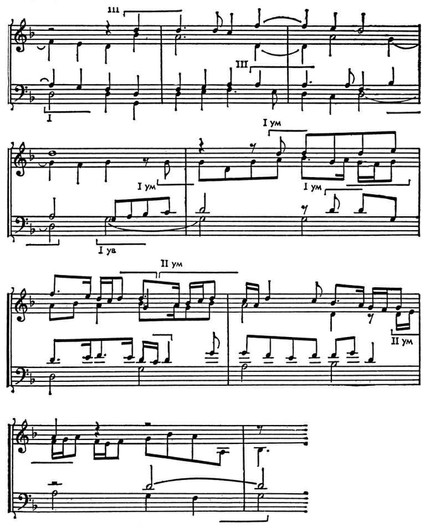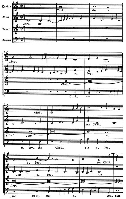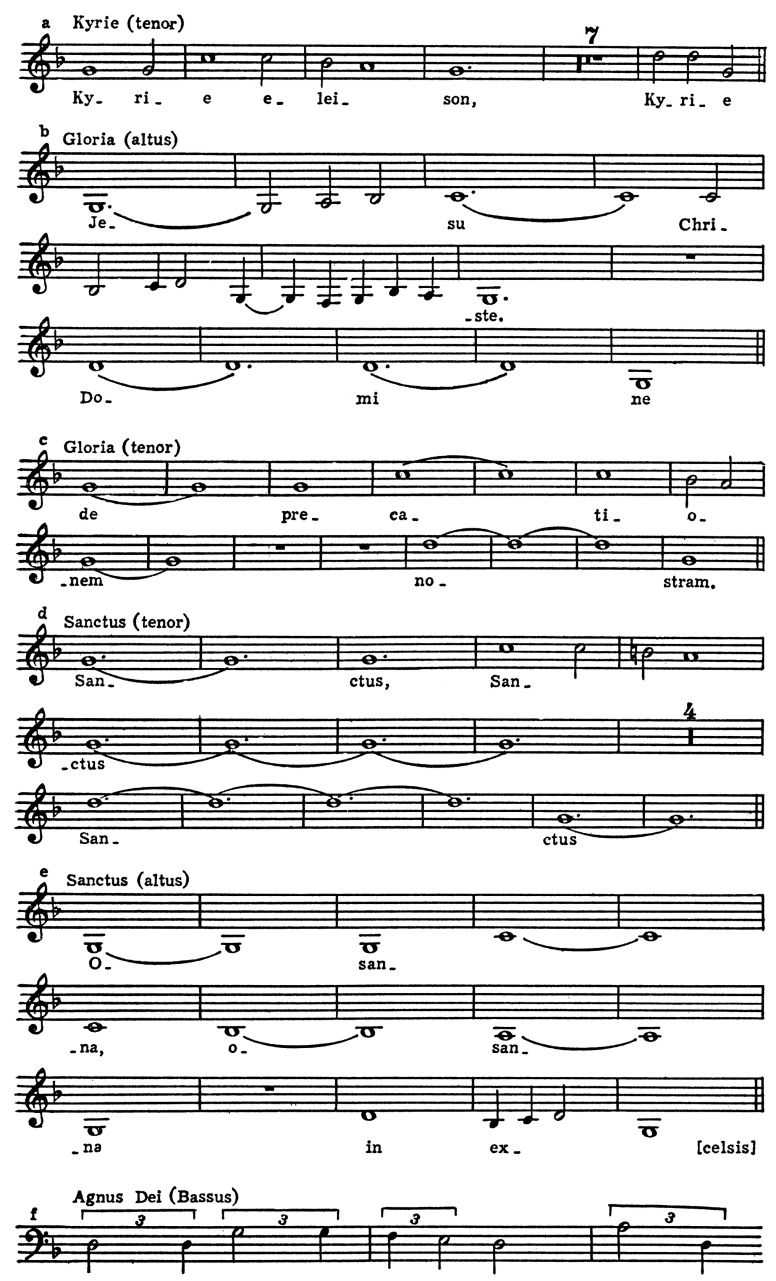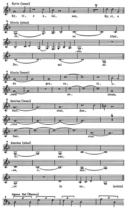 Пример мензурального канона Жоскена Депре приведён в ст. Канон (колонка 692) (иначе называется пропорциональным: записан композитором на одной строке и рассчитывается по авторским указаниям). В формах на cantus firmus последний многократно воспроизводится в У. (целиком или частями, чаще неточно, иногда с более мелкими нотами, заполняющими мелодич. скачки; см. пример в колонке 667).