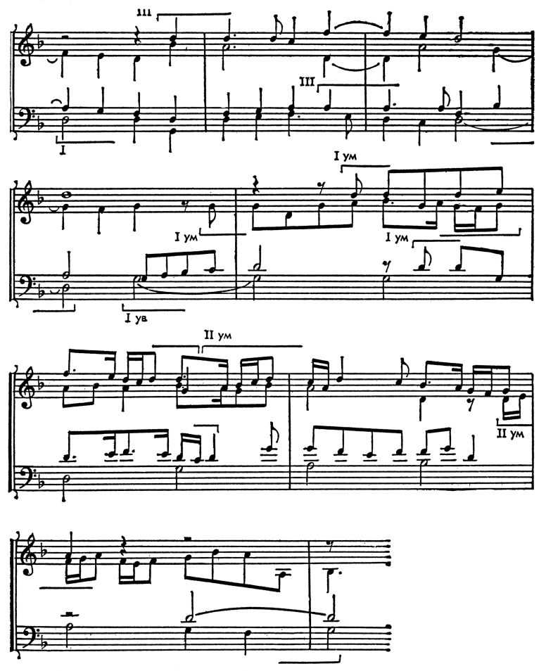 Cantus firmus в мессе Г. Дюфаи на L’homme arme. Приведены начала проведений, контрапунктирующие голоса опущены: а — основной вид; b — увеличение с дополнительными звуками; с, d, е — варианты увеличения; f — уменьшение. op. 87 Шостаковича тема в нормальном движении и одновременно тема в У., в такте 150 тема и её двух- и трёхкратное У.). У. усиливает осн. выразит. качество стретты — концентрацию тематизма, смысловую насыщенность, что особенно заметно в фугах с симф. развитием (стретта в разработочном разделе симф. поэмы «Прометей» Листа; виртуозная стретта из кантаты