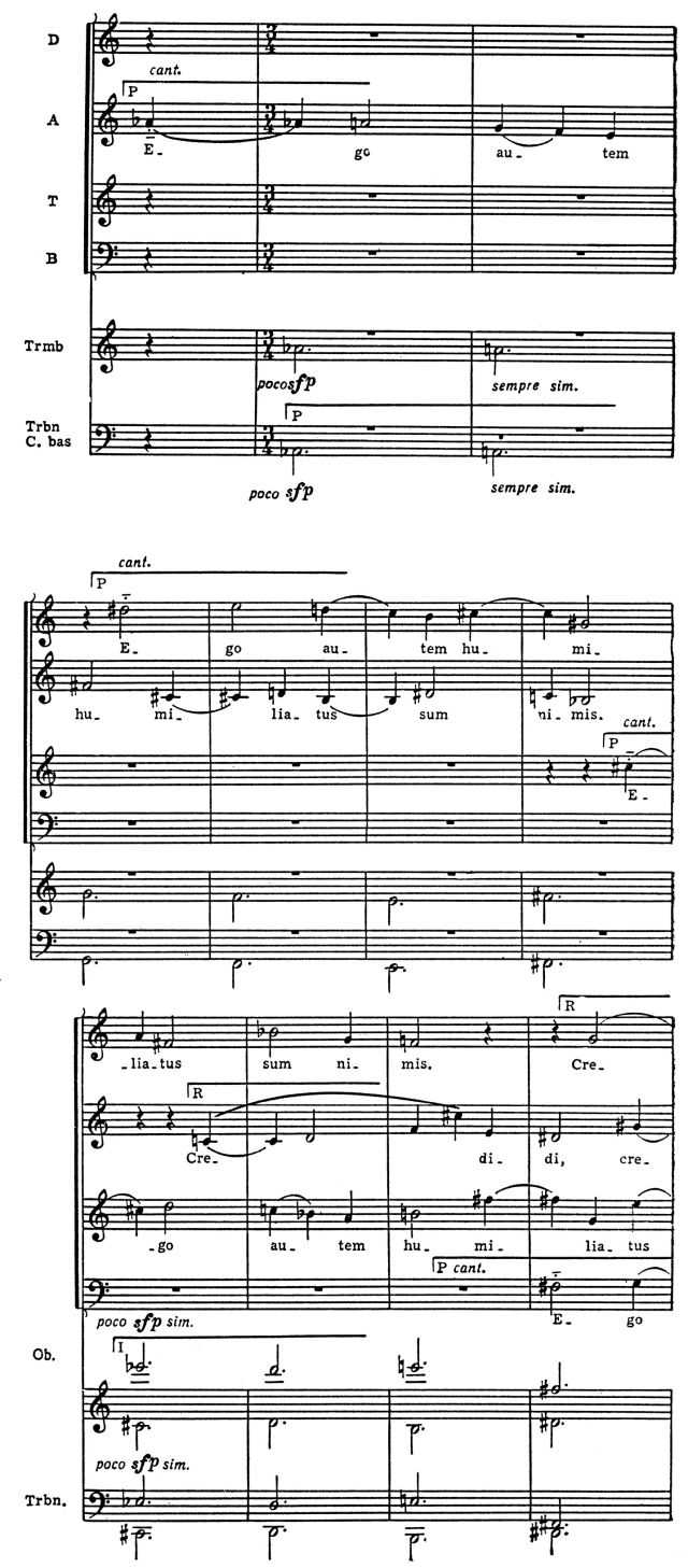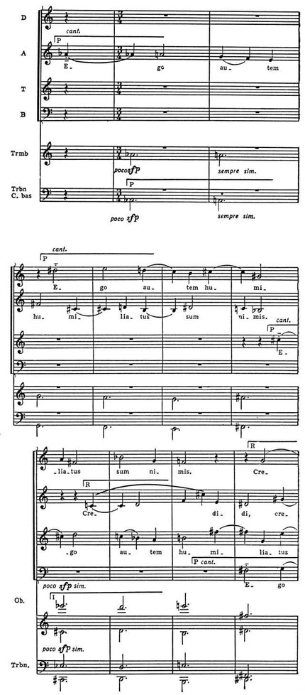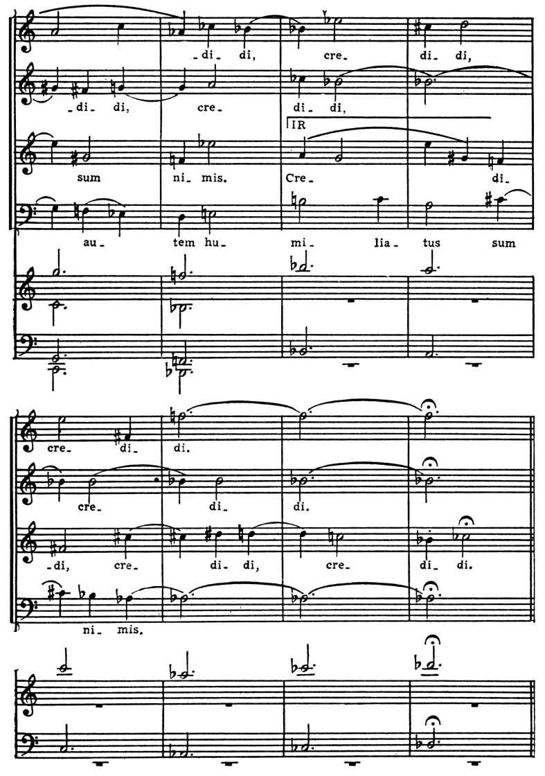 И. Ф. Стравинский. Canticum sacrum, часть 3-я, такты 219-236. Партии струнных, дублирующие хор, опущены. Р, I, R, IR - варианты серии.