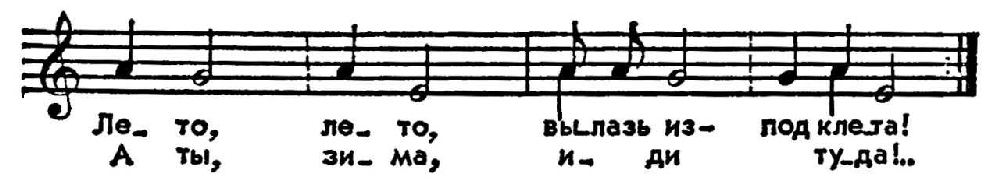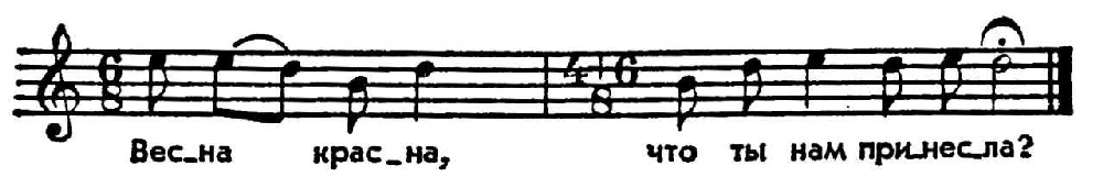 Встречаются также нисходящий мажорный тетрахорд и пентахорд, порой и звукоряд с тритоном между крайними звуками. Как и в нек-рых других обрядовых песнях, в В. каждая строфа заканчивалась особым выкриком, т.н. «гуканьем» (пережиток ритуального возгласа, коллективного заклинания). В В.-играх нередко используется антифонное пение. В.-хороводы часто имеют композиционно-выделенные припевы. Особенно характерны припевы волочебных песен: «Весна-красна на весь свет!» и т. п. Утратив своё прежнее магич. назначение, В. в ряде мест сохранились до наших дней-либо как детские песни, либо как лирич. песни пробуждения природы. Их напевы не раз претворялись в сочинениях рус. композиторов (оперы Римского-Корсакова «Ночь перед рождеством» и «Майская ночь», финал 1-го концерта Чайковского для фп. с орк. и др.).