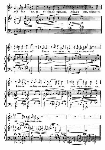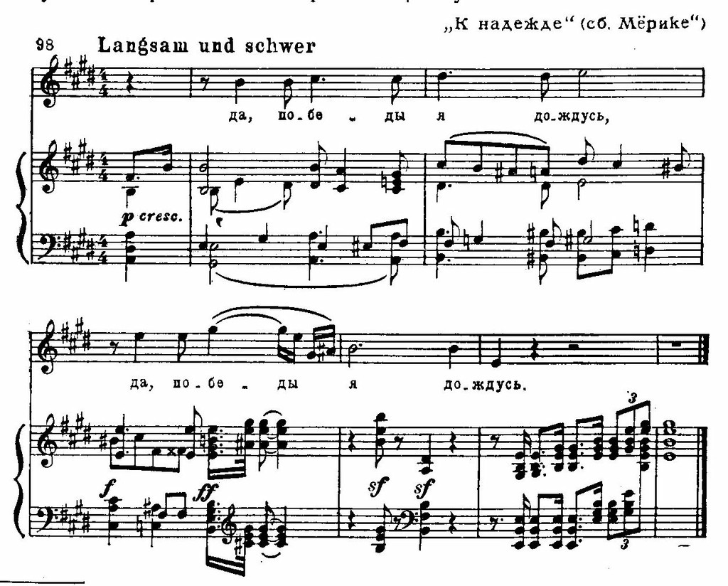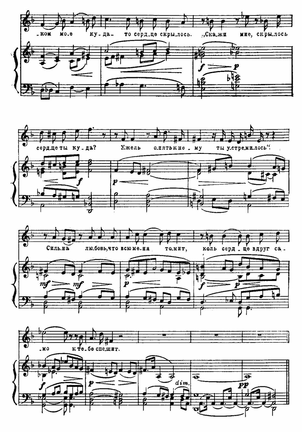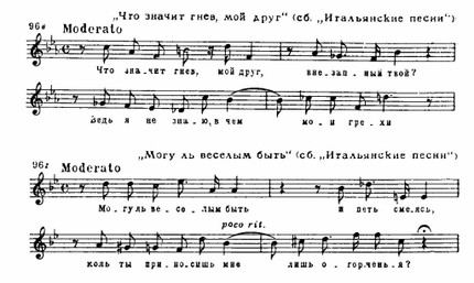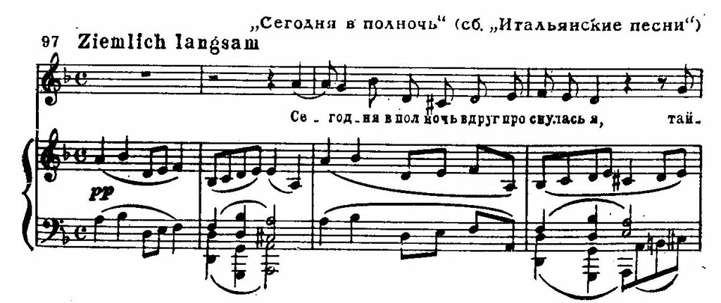 Изберем в качестве примера песню «Сегодня в полночь вдруг проснулась я» (из «Итальянской книги»). Пять тактов приходится в ней на фортепианное вступление и отыгрыш (d-moll, D-dur). С вступлением голоса первые четыре такта — спокойное повествование; следующие два — страстный вопрос (красочное сопоставление E-dur — секстаккорд Es-dur); далее два такта — сомнение; следующие два — признание (модуляция к G-dur) и заключительный призыв (G-dur — секстаккорд Es-dur):